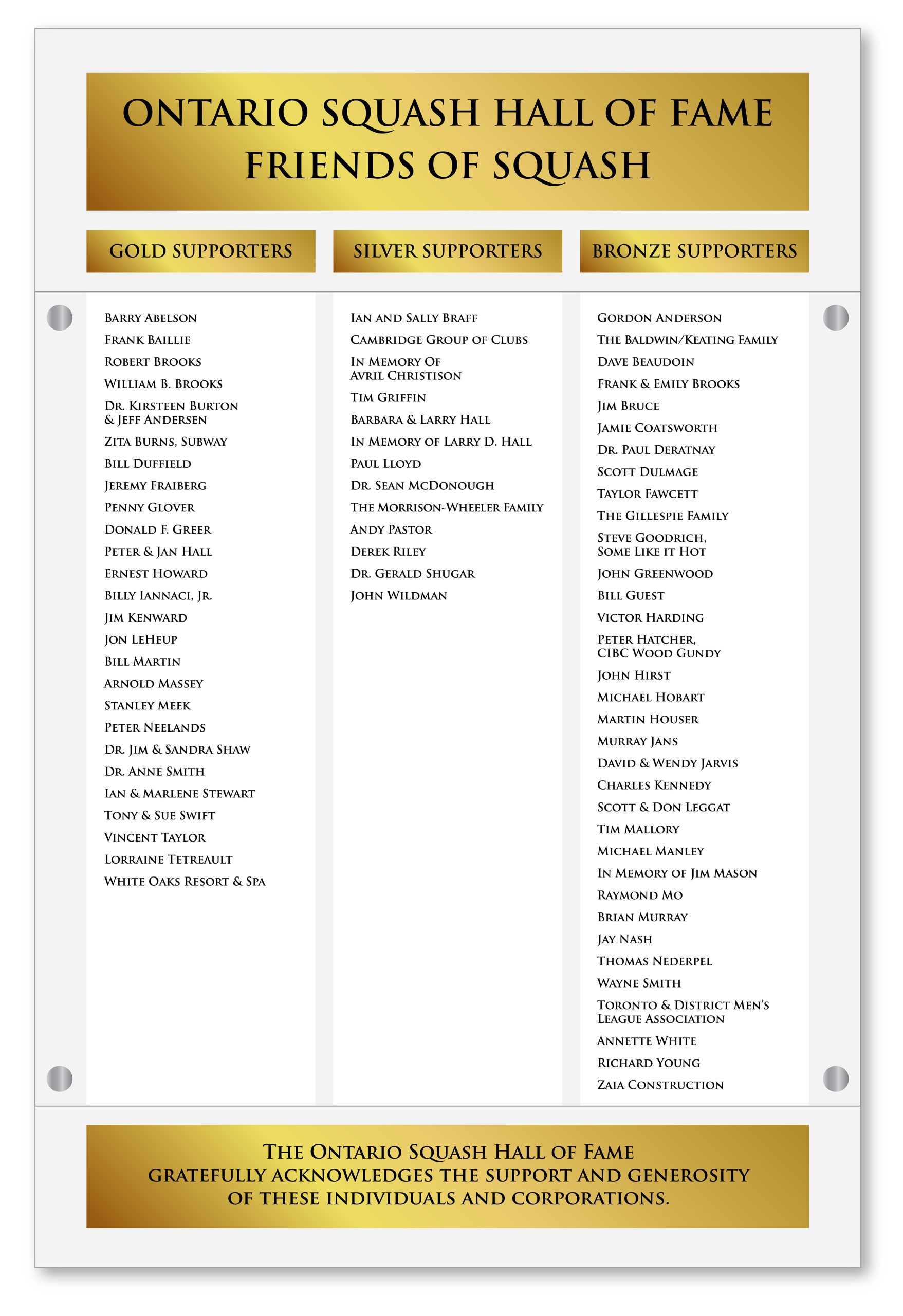 Upkeep and enhancements will be necessary to ensure that the environment is maintained in a professional manner; and there are plans to introduce many more features to the Ontario Squash Hall of Fame such as interactive programs.